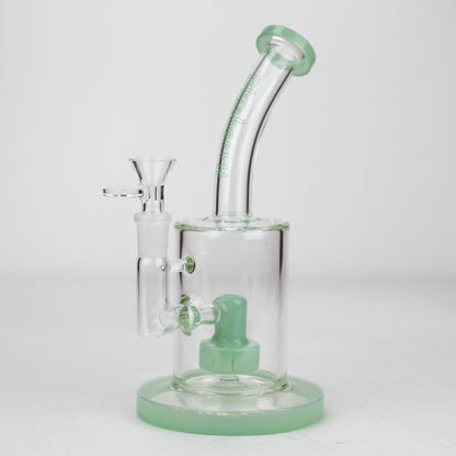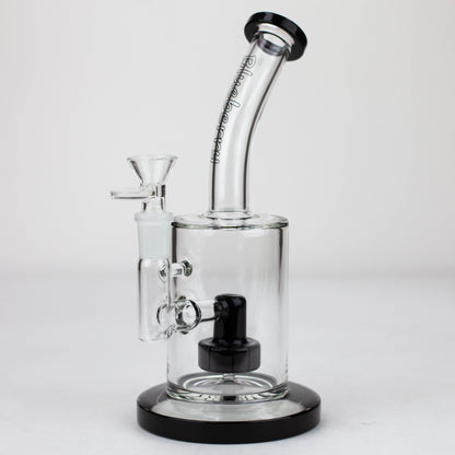 9" Blueberry Tire Perc Banger Hanger — V bowl and banger (with carb cap) included.Included are not only a quartz banger with a carb cap but also a glass herb bow, making it versatile to switch things up every now and then. The multiple slits in the percolator split up the smoke into smaller particles, allowing it to cool down significantly better. The neck is slightly curved and coloured accents adorn the base, percolator and mouthpiece.