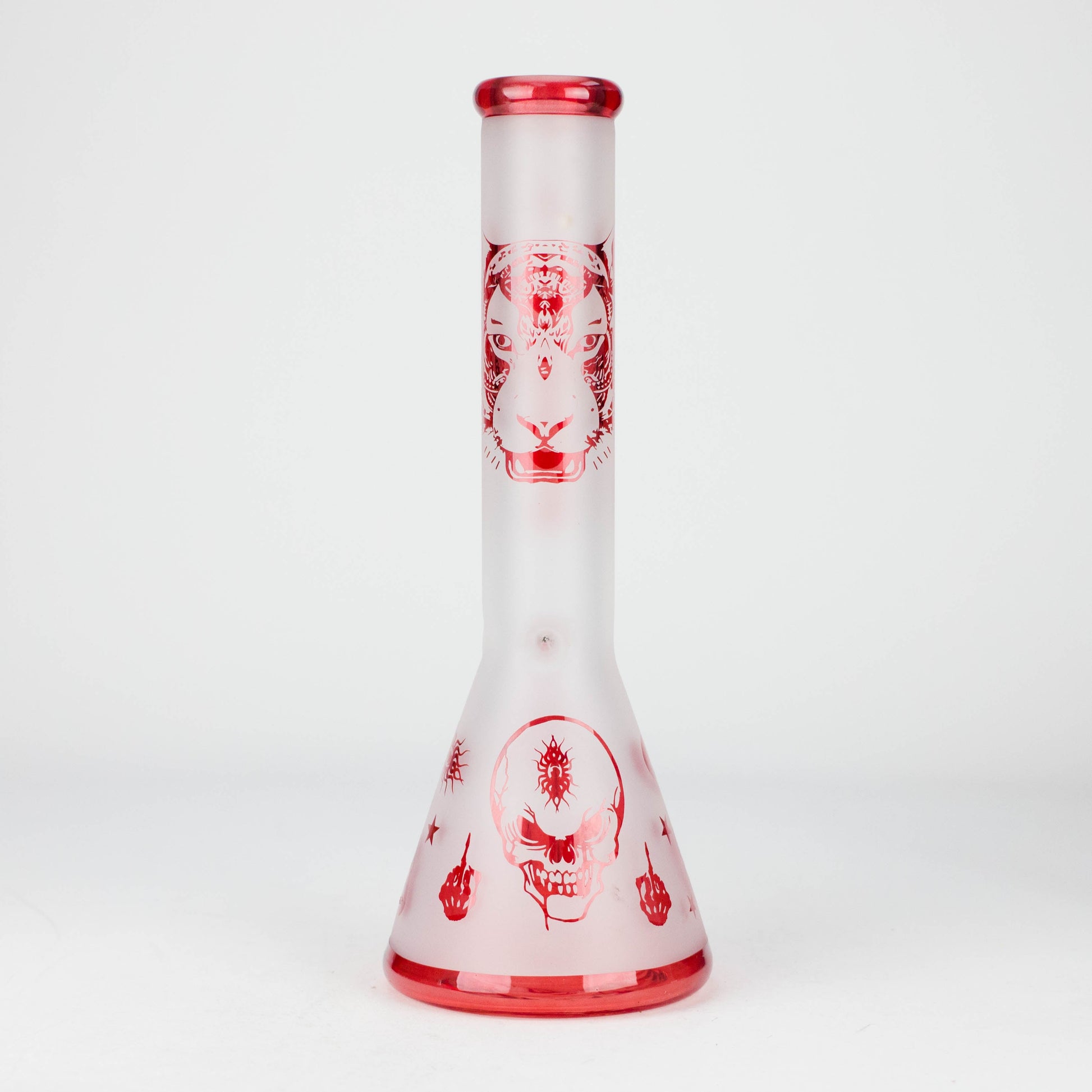 The FOGGX FT1649ATS is a premium 14-inch beaker-style glass water pipe constructed from thick 7mm glass for superior durability and stability. Featuring a sandblasted frosted finish with bold small skull graphics and red accents, this piece delivers smooth, consistent filtration while standing out on retail shelves. The wide beaker base provides excellent balance and enhanced water diffusion for a clean, satisfying draw.