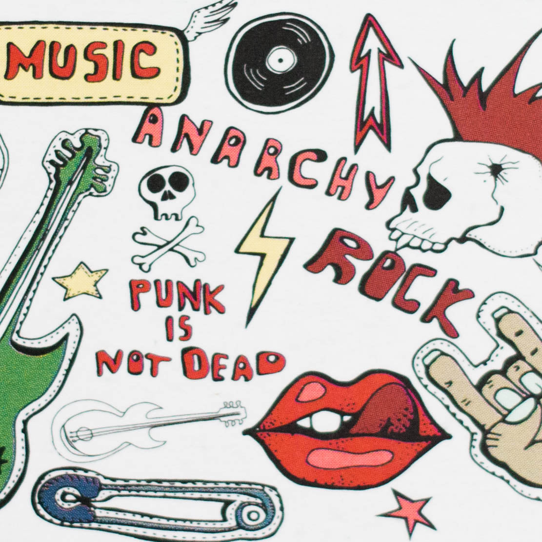 Teal color with rock music-inspired artwork