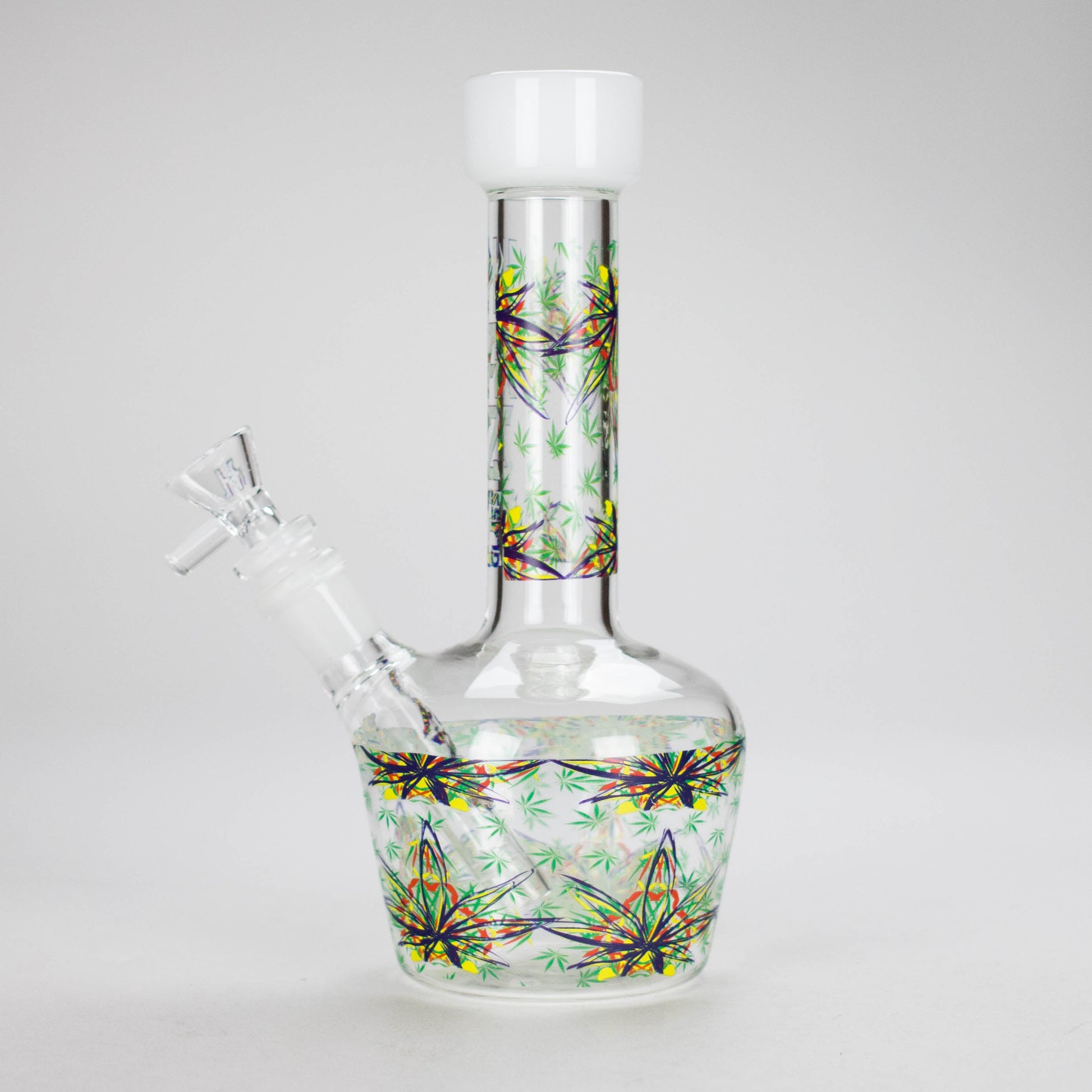 Sleek, stylish, and smooth-hitting — the Haze 9-Inch Leaves Dome Beaker Bong – Mini-O is the perfect addition to any collection. Featuring a classic beaker base with a dome-shaped chamber and white finish accented by subtle cannabis leaf graphics, this piece combines elegance with everyday functionality.