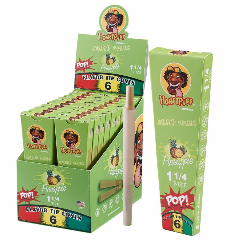 Add flavor to your session with HoneyPuff Pre-Rolled Flavored Cones, made from ultra-thin, slow-burning paper for a smooth, consistent draw. These 1 1/4 size cones come pre-rolled and ready to fill, with delicious flavor infused directly into the paper for an enhanced smoking experience. Each pack contains 6 flavored cones, and each display holds 20 packs—ideal for retail sales and gift bundles.