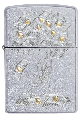 They say "money doesn't grow on trees", but doesn't it? This Satin Chrome lighter features just that. On this lighter is an auto engraved money tree, because isn't a money tree everyone's dream? Comes packaged in a gift box. For optimal performance, fill with Zippo lighter fluid.